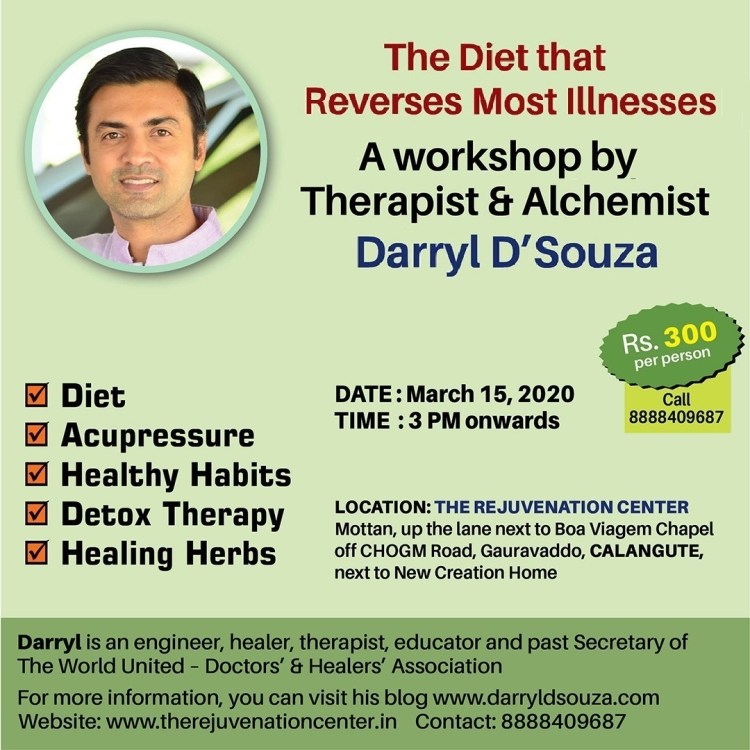 3 pm – 6 pm – The Diet that Reverses Chronic Illnesses. A workshop by Therapist & Alchemist Darryl D’Souza, Pioneer in Integrative Medicine www.darryldsouza.com Fee Rs.300 per person. Call 8888409687 for details.